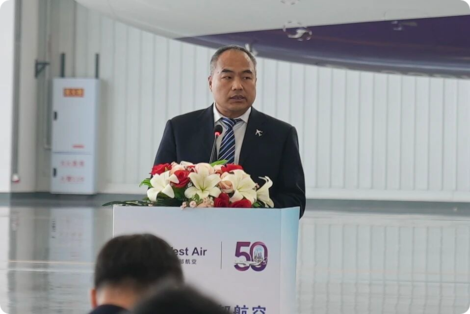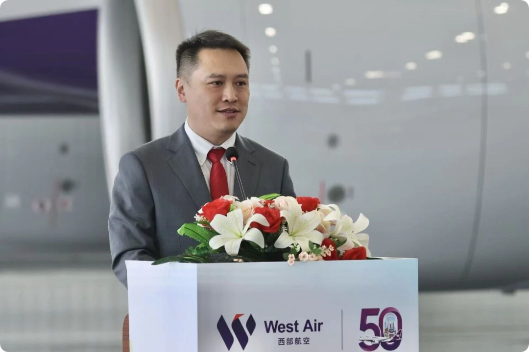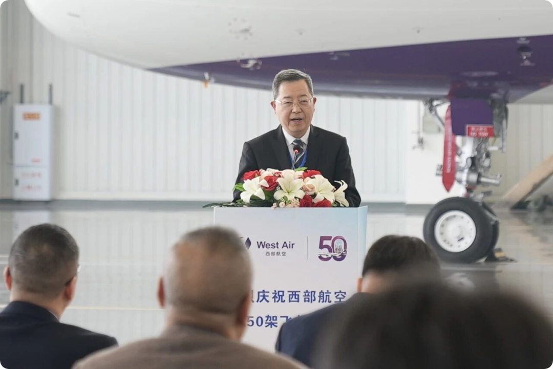 图:空中客车公司代表程立刚致辞。西部航空董事长王科在致辞中说道:“从寥寥数架飞机到50架机队规模,西部航空的每一步成长都离不开政府部门的指引、合作伙伴的支持。”他进一步指出,西部航空将以50架飞机为新起点,深化“政企协同”发展理念,优先在重庆主基地投放运力,深度参与成渝地区双城经济圈建设,通过航线网络优化、服务品质升级,助力重庆打造国际航空门户枢纽,以实际行动回报社会各界的信任与支持。仪式最后,重庆市交通运输委员会副主任万雅芬与西部航空董事长王科共同宣布飞机正式入列,标志着政企协同推动区域航空发展进入下一个新阶段。