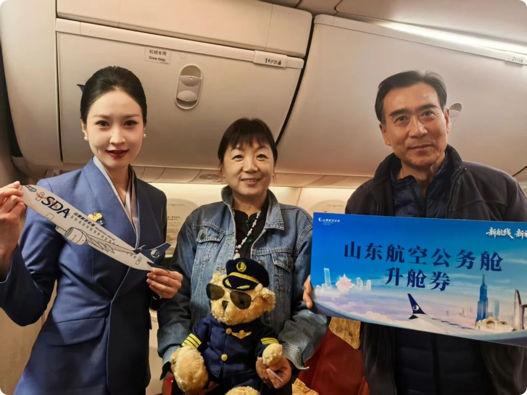 为营造双城文化交汇的沉浸氛围,山航在客舱内巧妙融入青岛“五月的风”雕塑与胡志明市歌剧院等地标元素,并在带有首航装饰的飞机座椅上放置可爱的“机长熊”纪念公仔,陪伴旅客温馨启程。航班进入平飞阶段,乘务组以双语广播向旅客致意,每位旅客均获赠山航精心制作的首航纪念登机牌,将这段旅程化为可珍藏的回忆。飞行途中穿插抽奖环节,幸运旅客获赠山航公务舱升舱券、飞机模型等好礼,为这趟跨越国界的飞行增添喜悦。