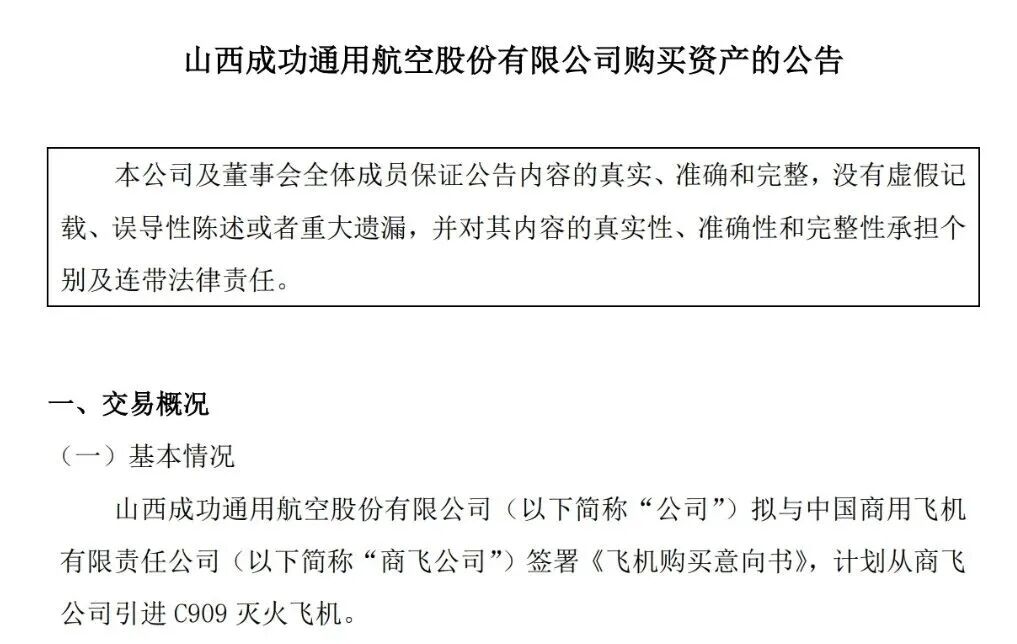 山西成功通用航空股份有限公司发布公告,拟与中国商用飞机有限责任公司签署《飞机购买意向书》,计划从商飞公司引进C909灭火飞机。其中3架为确认订单,3架为意向订单。按照意向书初步约定,意向书签订后,公司预先向商飞公司支付3架确认订单飞机的订金。