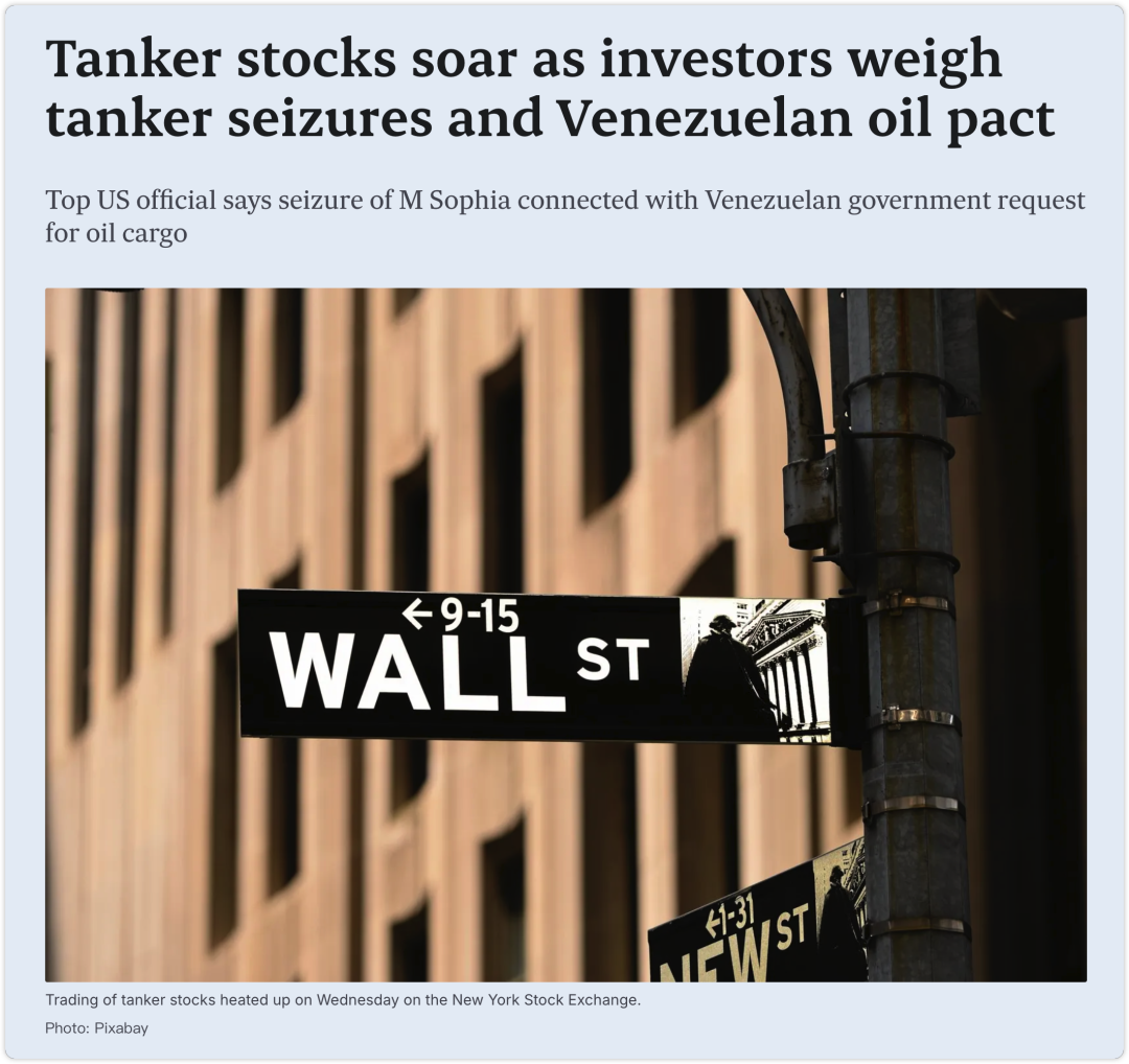 这一系列事件凸显了美国在委内瑞拉石油领域的强势主导:通过军事行动和扣押行动,确保石油资源向美国倾斜,同时打击规避制裁的“暗池船队”。市场对运力短缺的担忧迅速转化为油轮股的强劲买盘,投资者押注全球原油运输需求将进一步推高运费和船东利润。