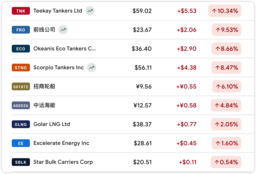 今天白天,招商轮船、中远海能等A股中的油轮股也均出现不同程度的上涨波动。