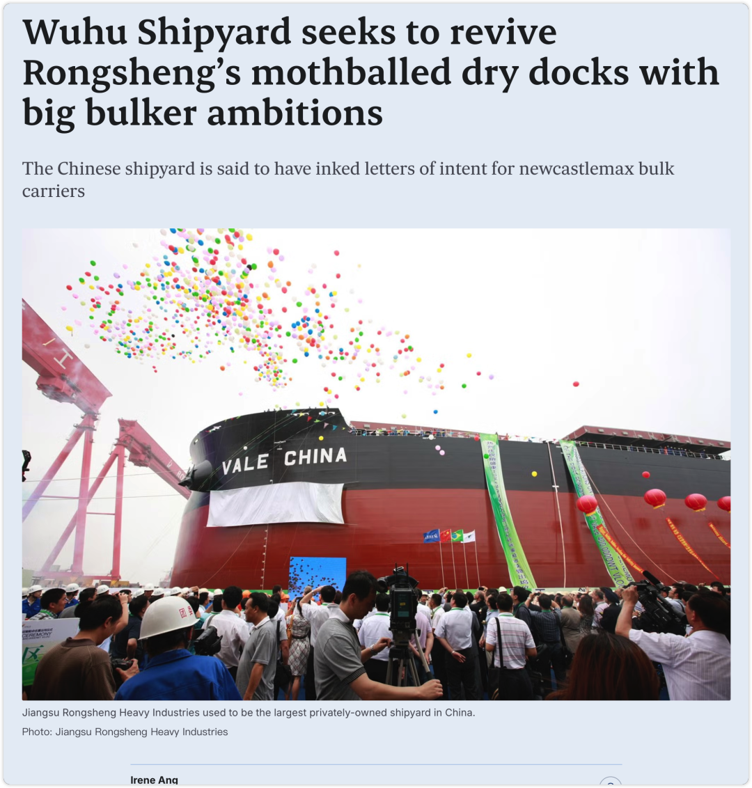 在这一背景下,芜湖造船厂的进驻被视为江苏熔盛重工“第三次重启”的重要变量。不过,业内对其前景仍持审慎态度。一位造船业人士指出:“芜湖造船厂此前并无大型散货船建造经验,而且目前自身在手订单规模已不小。”