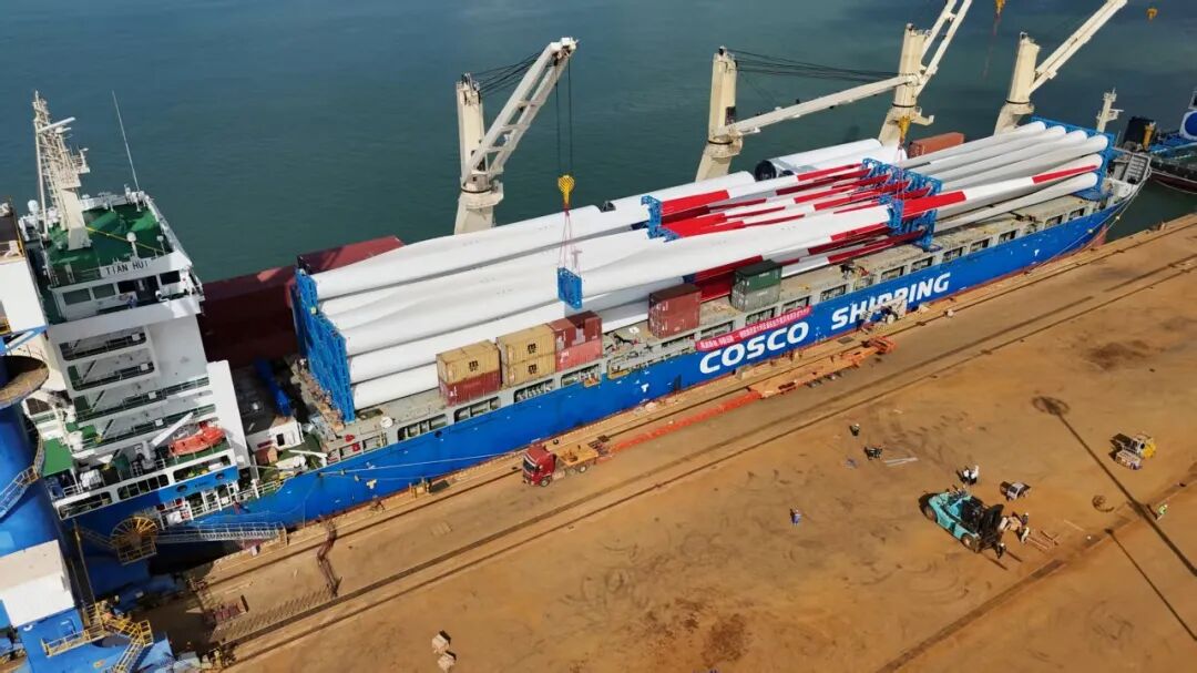 2025年10月,公司“天惠”轮自阳江启运9套总价值超1.3亿元的风电整机设备,“零货损”运抵意大利——该项目配套国内首个深水区海上风电项目装备出口,既擦亮了“阳江造”新能源装备的国际名片,更提升广东风电产业的全球竞争力。项目投产后年发电量可达9000万千瓦时,满足3万户意大利家庭用电需求,每年减少7.2万吨碳排放。