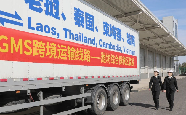 近日,一辆满载出口货物的GMS(大湄公河次区域“一证通六国”国际运输模式)车辆,在潍坊综合保税区海关监管作业场所完成查验施封后顺利启程驶向越南,这标志