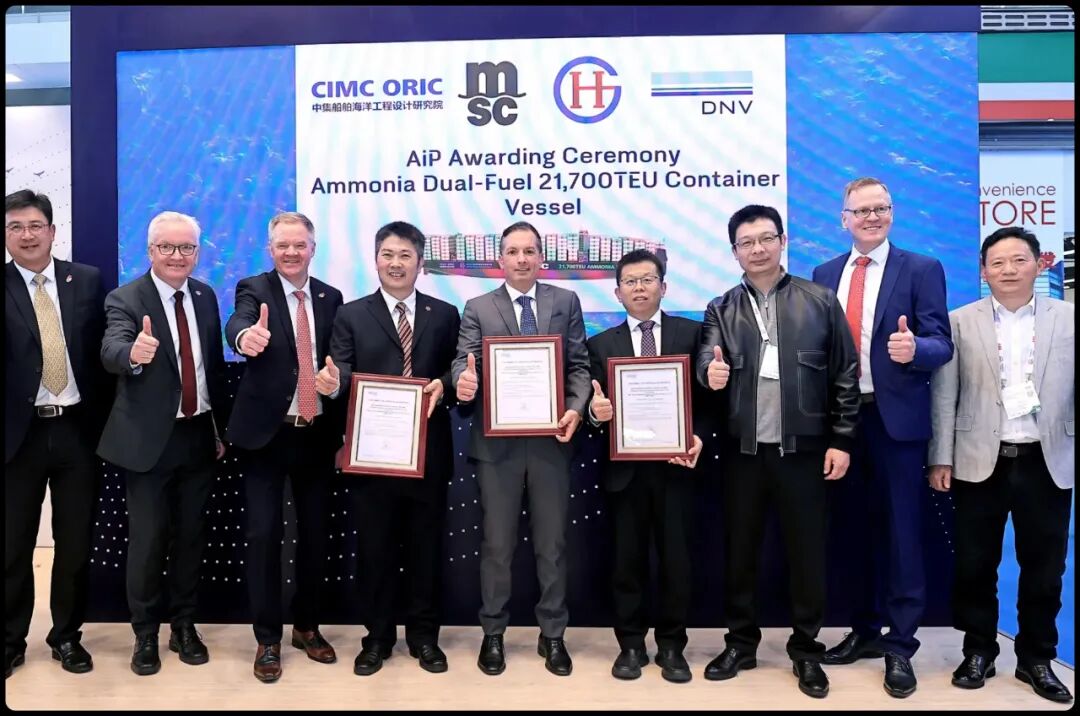 当瑞士地中海航运(MSC)联合中国舟山长宏国际、中集海工设计研究院(CIMC ORIC),从DNV手中接过21,700TEU超大型集装箱船氨燃料方案的原则性认可(AiP)时