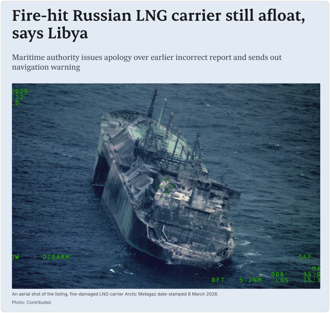 一艘隶属俄罗斯控制、受西方制裁的“影子船队”液化天然气(LNG)运输船——Arctic Metagaz号——在地中海遭遇严重火灾后,并未如先前部分报道所称沉没,目前仍漂