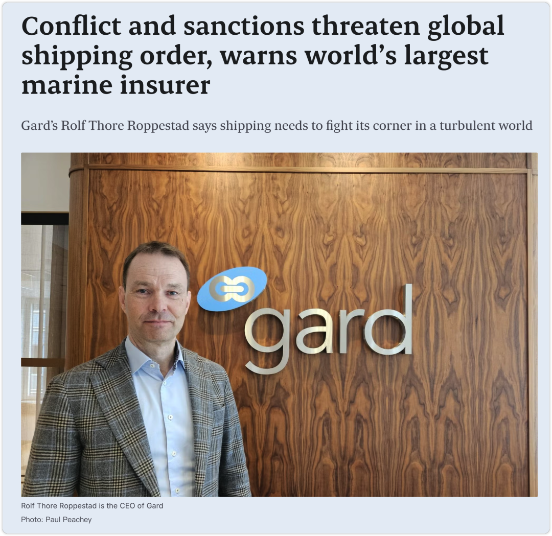 在全球航运业风雨飘摇之际,世界最大船东互保组织Gard的掌舵人Rolf Thore Roppestad发出最严厉警告:冲突与制裁正在撕裂二战后构建的全球航运秩序。如果航运
