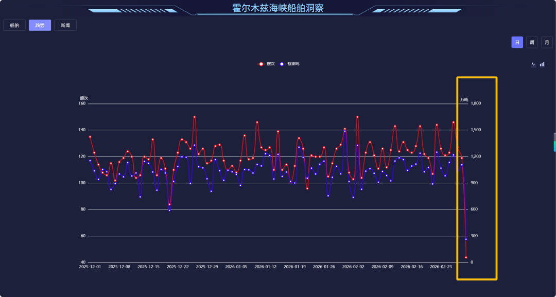 霍尔木兹海峡两端被迫滞留的船舶已有一百多艘,船舶通航数量断崖式下降: