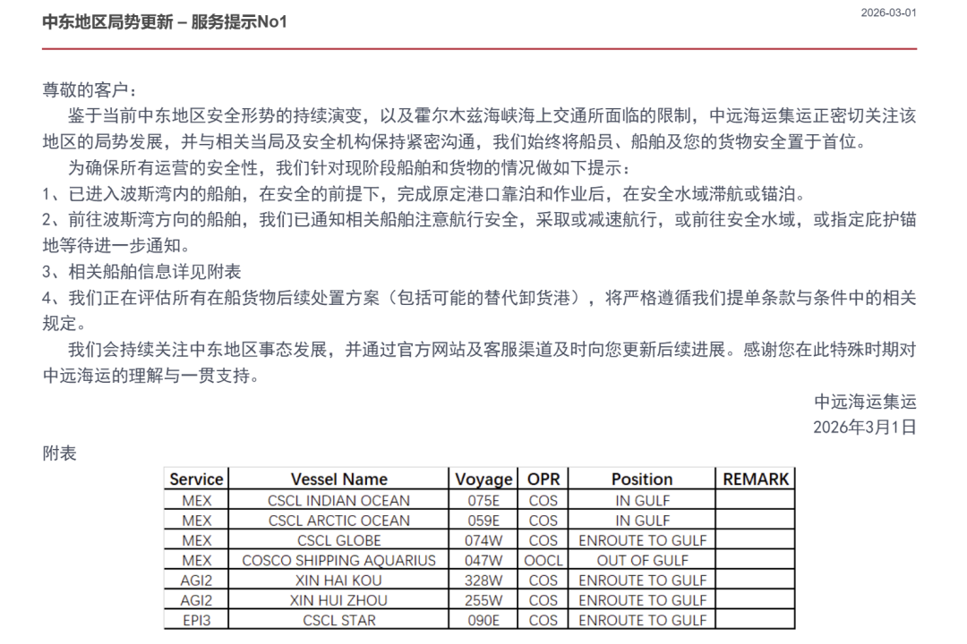 中远海运集运:已进入或正在前往波斯湾内的船舶,完成原定港口靠泊和作业后,前往安全水域滞航或锚泊,等待进一步通知。