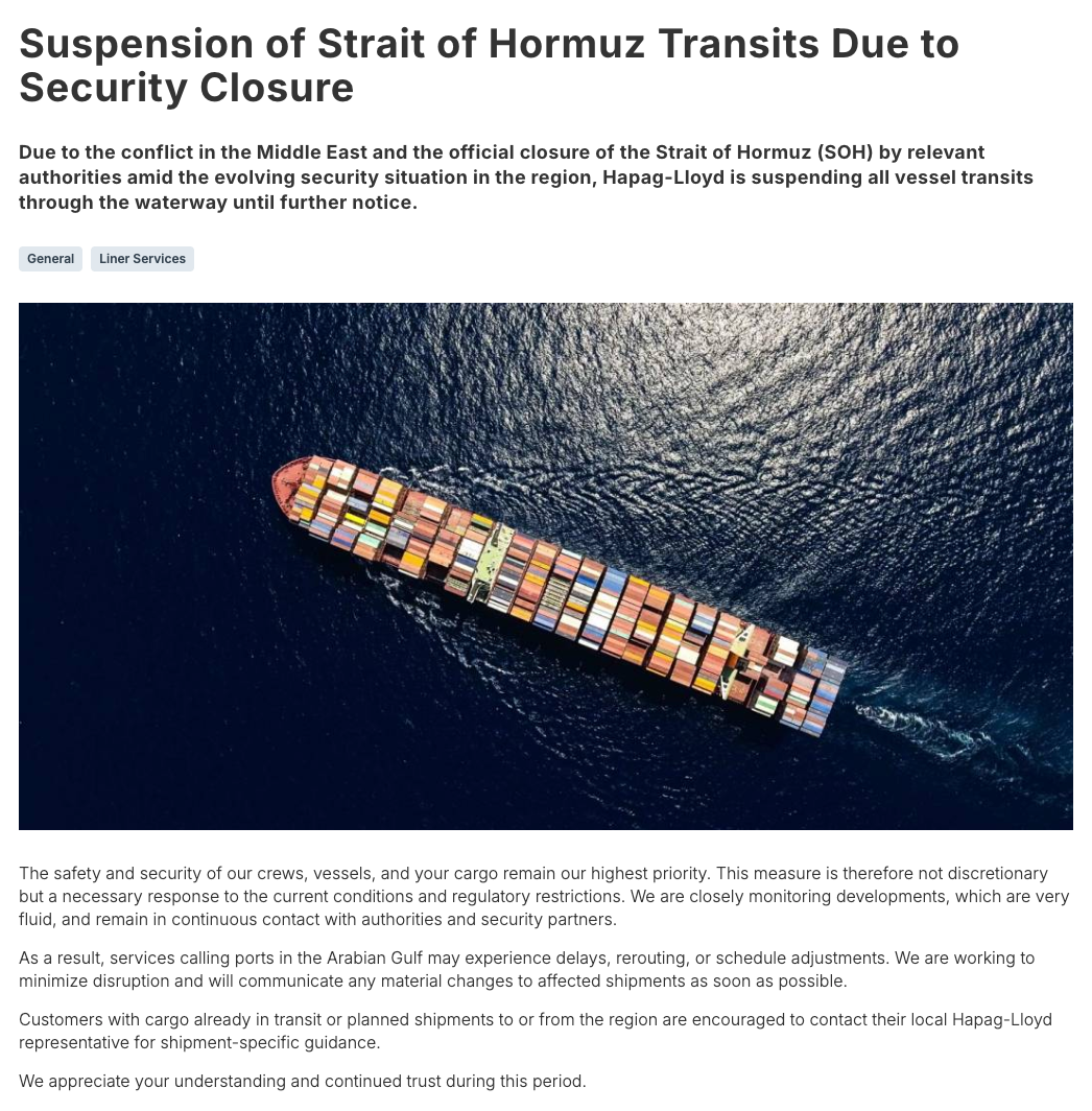 赫伯罗特:公司已暂停所有船舶在霍尔木兹海峡的通行,直至另行通知。