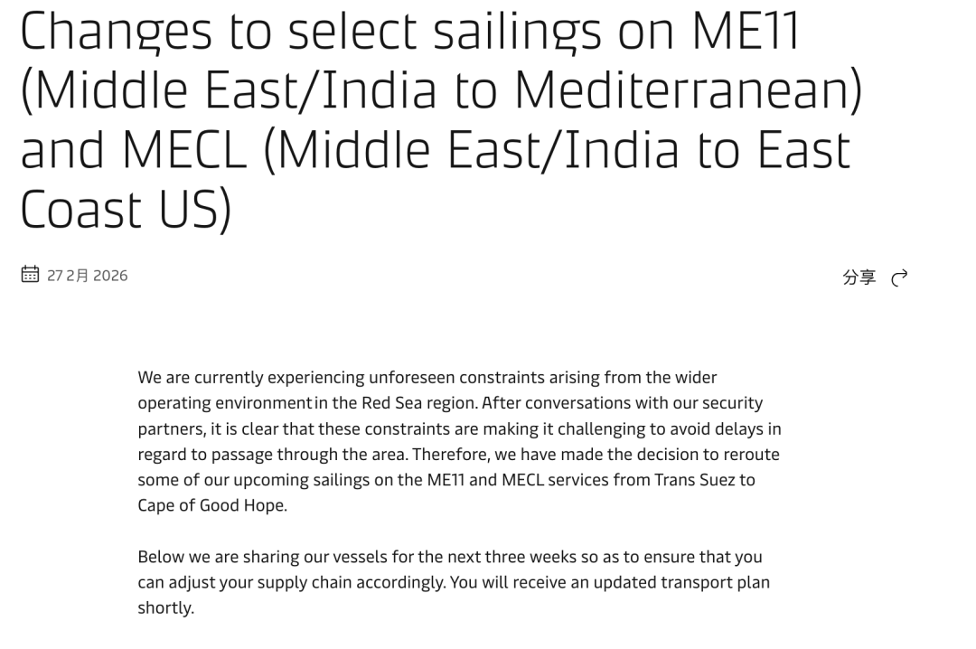 马士基:已宣布ME11和MECL航线部分班次从途经苏伊士改道至好望角。