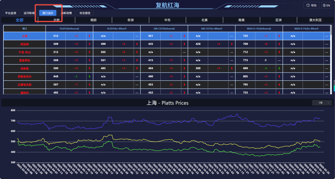 应用显示:全球各主要港口的油价普遍上涨。