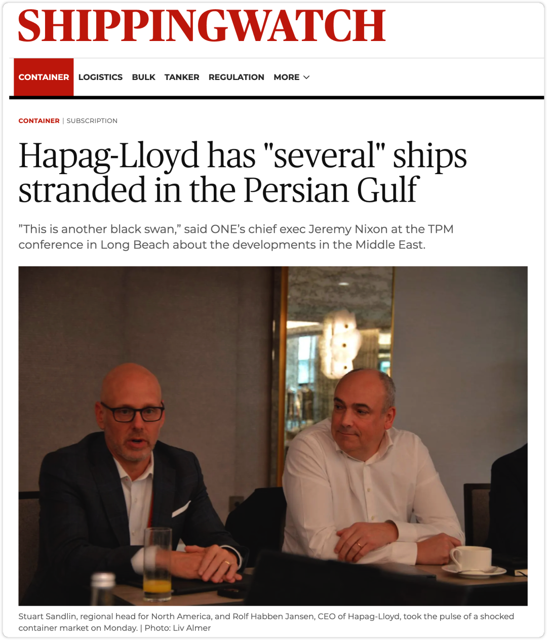 先看当下的量化冲击。行业分析师拉斯·延森测算,大约20万标箱的货载被困在波斯湾一带的船上。换个角度,这相当于全球约0.6%的集装箱运力瞬间失灵——如果把这些被困船队单列出来,它将是世界第13大班轮公司赫伯罗特的掌舵人 Rolf Habben Jansen在长滩TPM26上承认,公司的“若干”艘船被困,受影响运力约5万标箱;日本ONE的Jeremy Nixon 更直白:波斯湾内外大概有750艘船进退两难,其中约100艘是集装箱船,两侧各有350艘排队观望。这不是“轻微干扰”,这是又一只黑天鹅在会场上空盘旋,且每半小时就换一次飞行轨迹。