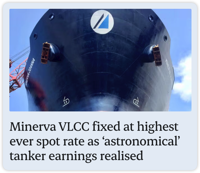 希腊油轮公司Minerva Marine的317,000载重吨Pantanassa号(2011年建造)被韩国炼油商GS Caltex Oil以每日436,000美元的天价租金固定,这是VLCC油轮有史以来最高的现货租金。这一交易尚未最终确认,但已证实了分析师描述为“天文数字”的纸面租金水平。该交易持续60天,总收入相当于2620万美元,可能从中东装载货物运往韩国,但装货港未指定。