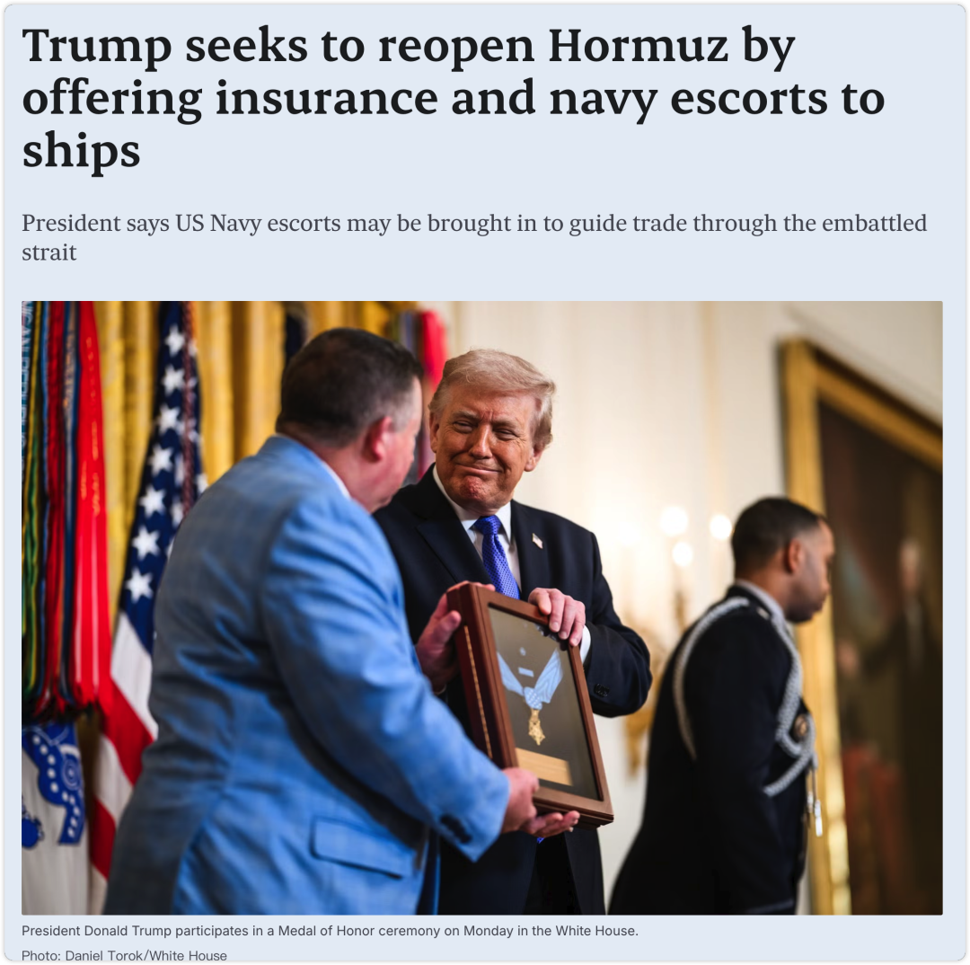 4、特朗普寻求重新开放霍尔木兹海峡:提供保险和海军护航
