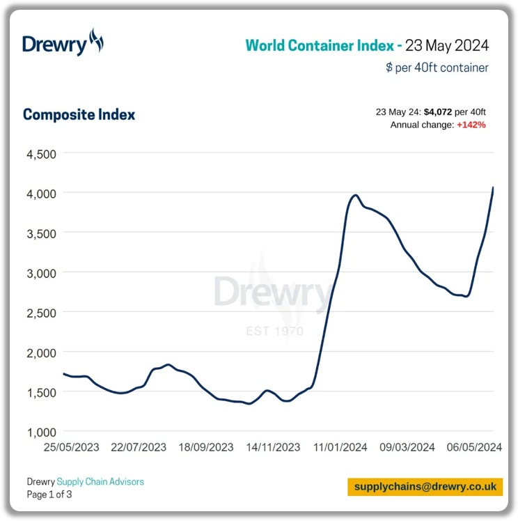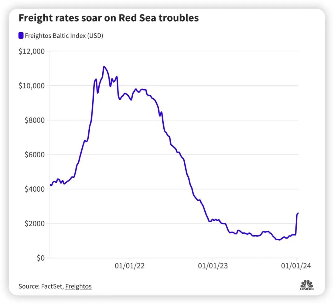 由于红海危机破坏了全球贸易,航运成本正在飙升。如果危机升级,通胀可能会再次抬头。集装箱船从苏伊士运河绕道南非好望角,对运费上涨产生了全球传导效应。